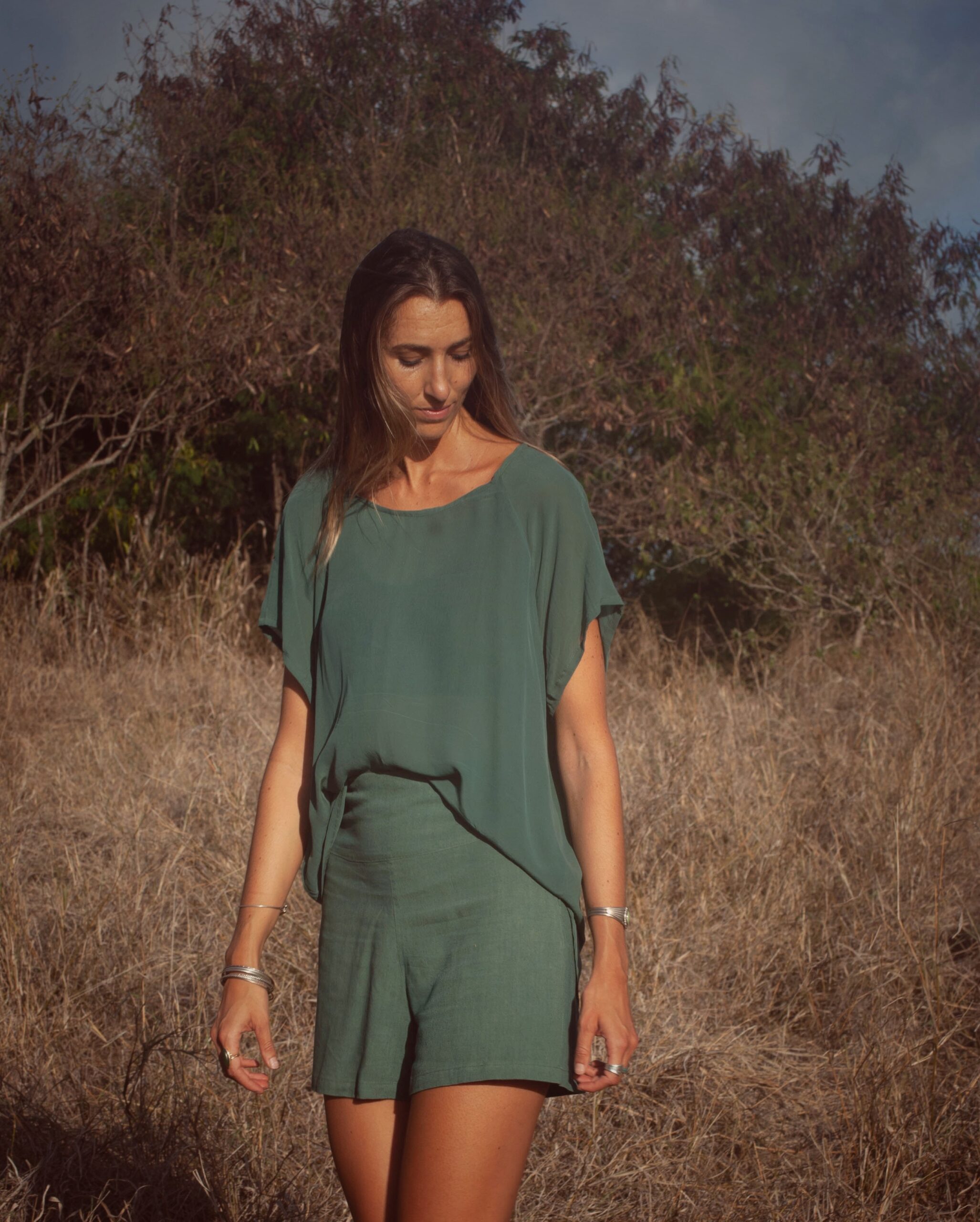 100% plant dyed sustainable silk. its elegant, light, smooth lines, loose, comfortable, moveable….